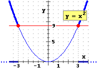 Se un punto del grafico di y = x2 sta sopra alla retta y = 9 la sua ascissa deve essere minore di -3 o maggiore di 3 (vedi figura): x < 3 o x > 3 La risposta (4) (che non potrebbe venire in mente se si pensasse ai grafici) non ha molto senso di per sé: la condizione x > -3 include la condizione x > 3. La risposta (2) confonde "e" con "o". La confusione è favorita dal fatto che talvolta si usa "e" per indicare l'unione tra due insiemi (sarebbe corretto dire: sono soluzioni della disequazione i numeri x tali che x < 3 e quelli tali che x > 3, ma questi sono i numeri x tali che "x < 3 o x > 3"). A scuola (e nelle soluzioni indicate dai libri) a volte "e", "o" e "," sono usati in modo errato; ad esempio viene scritta "x<3, x>3" come soluzione, invece di "x<3 o x>3" o, ad es., |