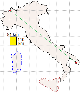 In un libro di testo si trova la cartina a fianco e la richiesta di calcolare la distanza tra le due località segnate con i pallini rossi. Come risposta viene indicata Valuta la risposta data e l'impostazione del libro (relativamente a questi contenuti). |