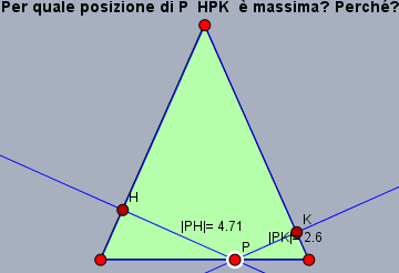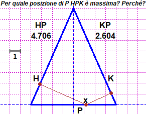 Il modo in cui è formulata la domanda e qualche ragionamento superficiale ci potrebbero indurre a pensare che la lunghezza è massima quando P è al centro o quando è ad una delle estremità della base. Ma osservando le animazioni ci rendiamo conto che la lunghezza di HPK non dovrebbe variare.