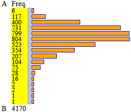 ![]() | Altezze in cm di un insieme di 1000 bambine dell'età di un anno A = 65 B = 82 intervals = 17 their width = 1 n=1000 min=66.932 max=81.9 median=74.139 1^|3^ quartile=72.522|75.826 mean=74.1577 | |
