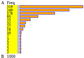 ![]() | Tempi in secondi tra l'arrivo di una telefonata e l'altra ad un servizio telefonico (o tra un accesso e l'altro ad un sito internet) di informazioni nell'orario di punta A = 0 B = 75 intervals = 15 their width = 5 n=1000 min=1 max=72 median=8 1^|3^ quartile=4|15 mean=11.171 | |