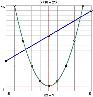 • Di fronte all'equazione x² - x - 10 = 0 posso immaginare i grafici di y = x² (parabola) e di y = x+10 (retta) e capire che ci sono due soluzioni, una positiva ed una negativa. Posso schizzare a mano i grafici e capire che le soluzioni sono tra -3 e -2 e tra 3 e 4. Sotto a sinistra i grafici fatti col computer (vedi). Posso poi (se ho già imparato a risolvere le equazioni di 2º grado) risolvere l'equazione e controllare i valori ottenuti con quanto dedotto dalla rappresentazione grafica.
