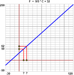 quelle in gradi Fahrenheit (F). Dal grafico (vedi la figura qui a destra) deduco che la temperatura varia circa tra 10 e 17 gradi centigradi. Come potrei risolvere il problema se non disponessi del grafico (e non fossi in grado di utilizzare il cellulare per risolverlo), ma conoscessi la formula che associa ai gradi centigradi quelli Fahrenheit? Suggerimento. Sai che F = 9/5·C + 32 e che Poi moltiplicali per 5. Poi dividili per 9. | ![]() |
