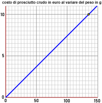 Quanto costava all'etto il prosciutto? Trova la risposta sia utilizzando il grafico qui a fianco sia facendo opportuni calcoli. Procedimento grafico: ![]() |