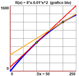 R'(x) = 8 − 0.02·x. R'(100) = 8 − 0.02·100 = 6. Per x = 100 il reddito marginale è di 6 m per unità. R'(200) = 8 − 0.02·200 = 4. Per x = 200 il reddito marginale è di 4 m per unità. Nella rappresentazione grafica a lato questi valori corrispondono alle pendenze delle due rette di color rosso. |