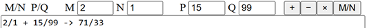 Ovviamente potremmo procedere "a mano": 2 + 15/99 = 2*99/99 + 15/99 = (2*99+15)/99 = 213/99. Possiamo semplificare questa frazione?