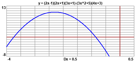 Ma se voglio controllare il calcolo posso tracciare direttamente il grafico di y=(2x-1)(2x+1)(3x+1)-(3x²+5)(4x+3) col computer (ad esempio con questo script; ma potrei usare WolframAlpha) e verificare che effettivamente si tratta di una parabola: