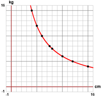 cm kg --------- 15 4 12 5 10 6 8 7.5 7.5 8 6 10 5 12 4 15 | 60/15 = 4 60/12 = 5 60/10 = 6 60/8 = 7.5 60/7.5 = 8 60/6 = 10 60/5 = 12 60/4 = 15 A sinistra abbiamo rappresentato i punti che corrispondono a questi dati e abbiamo tracciato una curva che passa per essi. Se indichiamo con x la distanza in cm dal centro del bullone e con y quella della forza in kg, possiamo dire che x·y = 60, ovvero y = 60/x. La curva tracciata a sinistra non è altro che il grafico della funzione che ad x associa 60/x. |