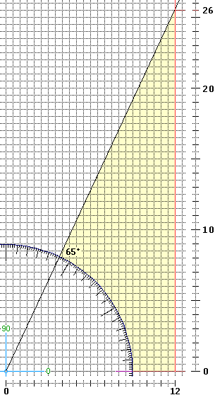 | α = 65°, d = 12 m Sul grafico a lato "leggo" 26 m (valore arrotondato a due cifre; arrotondati erano, ovviamente, anche i dati di partenza). Per altri commenti: proporzionalità neGli Oggetti Matematici.Successivamente, si possono fare i calcoli facilmente con lo script "tri ang-lato-ang" ottenendo: ![]() L'insegnante può controllare i calcoli anche con la "calcolatrice" accessibile da qui: 65 [°] 1.1344640137963142 (B) B [tan] 2.1445069205095586 (B) B*12 25.734083046114705 che arrotondo a 26. | |