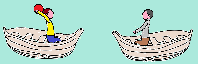 Due ragazzi sono in due barche vicine, su un lago tranquillo, posizionate nel modo illustrato a sinistra. Essi si lanciano, avanti e indietro, una palla medica, ossia una palla pesante riempita di sabbia. Che cosa accade alle due barche, inizialmente ferme? Si avvicinano, si allontanano o rimangono nelle stesse posizioni? Perché? |