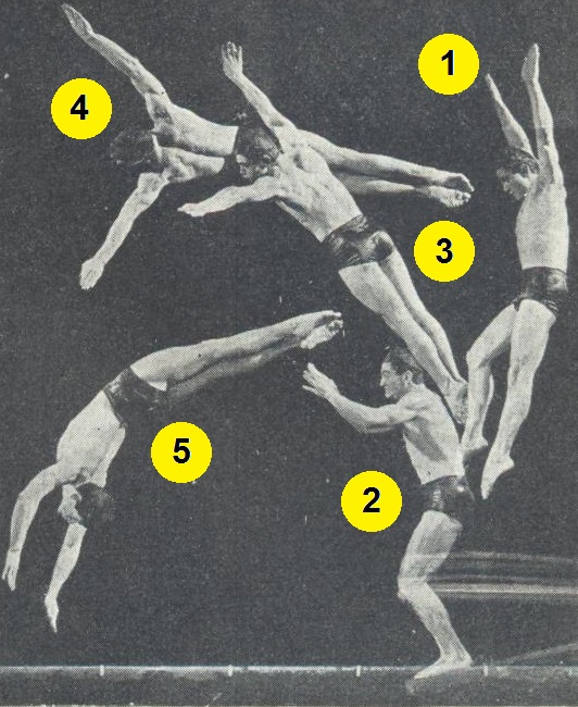 Alcune foto di un tuffatore che si muove dal trampolino all'acqua. In quali dei movimenti (da 1 a 2, da 2 a 3, da 3 a 4 o da 4 a 5, o in movimenti intermedi) l'energia cinetica aumenta? In quali aumenta l'energia potenziale?