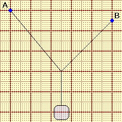 | I cavi esercitano, complessivamente, sul carico una forza opposta alla forza peso dovuta alla massa del carico. Rappresento la forza peso con un vettore OC di 21 mm (1 mm -> 1 quintale). Traccio il suo opposto OD, che rappresenta la forza dei cavi. Devo trovare due vettori diretti come OA e OB la cui somma sia OD; essi sono le forze esercitate dai singoli cavi sul carico, che sono di uguale intensità a quelle, opposte, che essi esercitano sugli anelli. Posso tracciare la parallela ad OB passante per D: in questo modo ottengo sulla retta OA un punto E tale che i vettori OE ed ED, che hanno come somma OD, siano uno diretto come OA e l'altro come OB. Volendo, invece di ED, considero il vettore uguale OF. Misuro col righello OE ed ED e ne deduco che le forze che essi rappresentano sono di, rispettivamente, 15 e 13 quintali (se voglio esprimere le forze in Newton - forza che accelera la massa di 1 kg di 1 m·s-2, supponendo che l'accelerazione di gravità nella zona considerata sia 9.81 m·s-2, ottengo ad es.: 15 qf = 15 ·102 kgf = 15 ·102·9.81 N = 15 ·103 N - potevo procedere mentalmente tenendo conto che 1 N è la forza esercitata da 98 g, ossia da circa 1 hg).
