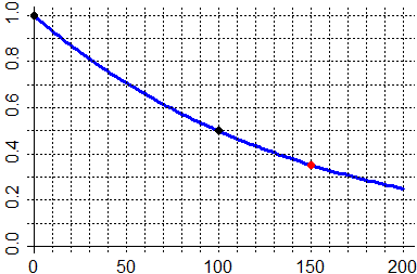 # Da x^100=1/2 ho 100*log(x) = log(1/2), log(x) = log(1/2)/100 x <- exp(log(1/2)/100); x^150 # 0.3535534 poco più di 1/3