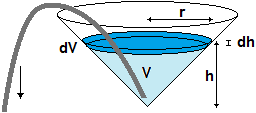 | Un serbatoio ha la forma di cono circolare retto, con la base collocata orizzontalmente e il vertice posto in basso rispetto ad essa. Il raggio della base è di 3 m e la profondità è di 4 m. Se il serbatoio è pieno d'acqua, quanto lavoro occorre compiere contro la forza di gravità per pomparne fuori tutta l'acqua? (usa i suggerimenti forniti dalla figura a lato). | ![]() |