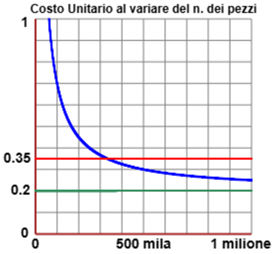 | Facciamo riferimento al caso illustrato nel precedente esercizio. Supponiamo che il nostro artigiano fissi in 0.35 € il prezzo di vendita di un tappo. Facendo riferimento al grafico a fianco stabilisci (all'incirca) quanti tappi deve produrre e vendere l'artigiano per essere in attivo. Motiva la risposta. | ![]() |