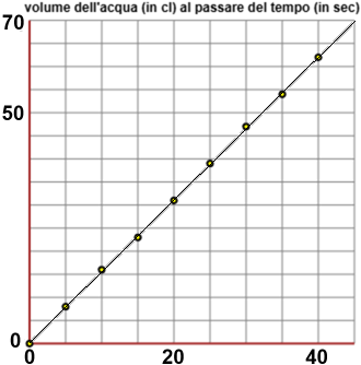 ![]() | Si capisce che il volume di acqua che scende aumenta con velocità costante: i pallini sul grafico appaiono quasi perfettamente allineati, lungo una retta passante per il punto (0,0). Cerchiamo di individuare questa retta come grafico di una opportuna funzione. Troviamone la pendenza. La retta tracciata a sinistra passa quasi perfettamente per l'ultimo punto, che a 40 (secondi) associa 62 (centilitri). Se indichiamo con x i secondi e con y i centilitri possiamo dire che tale retta è il grafico di Oppure potremmo prendere la retta che passa per il punto in alto a destra, il punto (45,70), ossia |