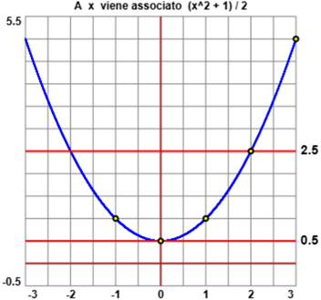 | (a) H(1) = (1²+1)/2 = 2/2 = 1, H(0) = (0²+1)/2 = 1/2, (b) H(x) = (x²+1)/2 (c) Vedi sotto. (d)-(e) 2.5 è l'immagine sia di 2 che di -2; 0.5 è l'immagine solo di 0. |