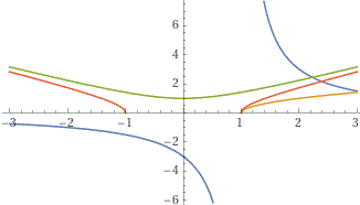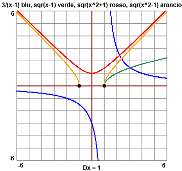 plot 3/(x-1), sqrt(x-1), sqrt(x^2+1), sqrt(x^2-1), x = -3..3