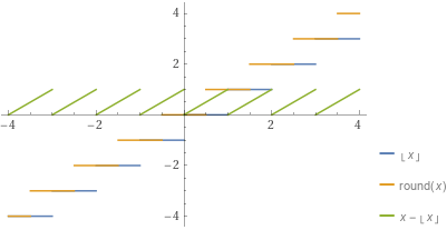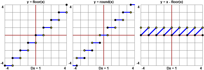 plot y = floor(x), y = round(x), y = x-floor(x), x = -4..4