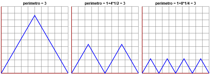 | Sia P(N) il perimetro. Se N = 1 abbiamo un unico triangolo, che ha come perimetro 1·3 = 3. Per N = 2 la nuova figura ha lo stesso perimetro. Infatti - vedi illustrazione a lato - la nuova figura è ottenibile da quella precedente "ripiegandola" in modo che il punto A vada sul punto B. Precisando questa intuizione, osserviamo che se raddoppio (o moltiplico per k) il numero dei triangoli dimezzo (divido per k) le dimensioni dei lati, per cui il perimetro complessivo (che è la somma dei perimetri dei triangoli) rimane invariato. Dunque per ogni N P(N)=3. Vedi la figura sottostante. Quindi il limite per N → ∞ è 3. Si noti che, in qualche modo, questo esito cozza con l'intuizione: la figura tende a confondersi col segmento, che è lungo 1; anche se pensassimo di percorrerlo in entrambe le direzioni in modo da tornare nel punto di partenza, avremmo un percorso lungo 2, diverso da 3. |