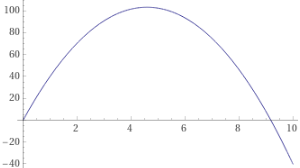 plot 45*t - 4.9*t^2, 0 < t < 10d/dt 45*t - 4.9*t^2, t=0 45 (vel. inziale di lancio) maximize 45*t - 4.9*t^2 max = 10125/98 at t = 225/49 max ≈ 103.32 at t ≈ 4.5918 (alt. massima) solve 45*t - 4.9*t^2 = 0 t = 450/490 ≈ 9.1837 (quando tocca terra) d/dt 45*t - 4.9*t^2, t=450/49 -45 (vel. quando tocca terra, opposta a quella di partenza) Potevo trovare il massimo anche trovando dove si azzera la deriv. solve (d/dt 45*t - 4.9*t^2=0) for t t = 225/49 45*t - 4.9*t^2, t = 225/49 103.316
