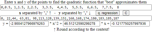 | Nel grafico a fianco è tracciata la parabola che approssima i dati, realizzata con lo script online quattro, dove si è utilizzata la funzione polinomiale di 2° grado che approssima i dati i cui coefficienti sono stati ottenuti con lo script "regressione quadratica" presente qui, di cui verrà discussa l'impostazione in una successiva voce ("correlazione tra variabili casuali"): |