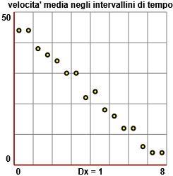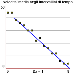 La tabella sotto a sinistra riporta le posizioni dell'auto in funzione del tempo trascorso, misurati a partire da quanto l'autista inizia a frenare (dopo 1.5 s, a 70 m dalla posizione della prima foto). Nel grafico a sinistra la tabella è rappresentata graficamente. Al centro è rappresentata graficamente la velocità media nei vari intervallini di tempo; il grafico oscilla a causa degli errori di arrotondamento (le differenze tra i tempi e gli spazi calcolate risentono delle approssimazioni dei dati). Nel grafico a destra è evidenziato che approssimativamente la velocità scende con una pendenza -40/7 ≈ -6. Possiamo dire che l'auto perde ogni secondo circa 6 m/s di velocità, ovvero che subisce una decelerazione di circa 6 m/s².