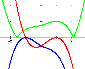 ![]() | Il grafico rosso (quello che sta in parte sopra e in parte sotto all'asse x) ha pendenza nulla per una x compresa tra -1 e 0 e per x=1: in corrispondenza di queste x il grafico della pendenza (grafico rosso a sinistra) taglia l'asse x, e sta sopra all'asse x per x comprese tra queste due in quanto è in tale intervallo che il grafico originale cresce. Per una x compresa tra 0 e 1 il grafico cambia concavità: ivi il grafico della pendenza ha un massimo locale.
