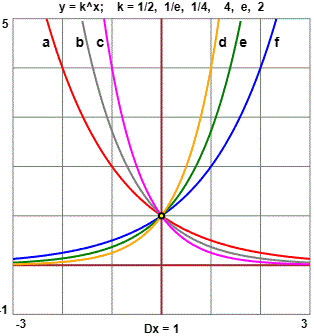 y = ex ha pendenza 1 nel punto di ascissa 0, y = 2x (2 < e) ha ivi pendenza minore, y = 4x ha ivi pendenza maggiore. y = 1/kx hanno come grafico quello di y = kx ribaltato attorno all'asse y |