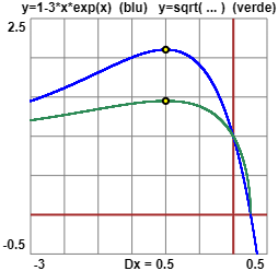 | d(13TeT)/dT = 0 3·(1·eT + T·eT) = 3eT(1+T) ha segno opposto a quello di T+1 in quanto eT>0. Dunque 13TeT cresce per T≤1 e decresce per T≥1, e assume in 1 il valore massimo, pari a 1+3e1. Questo valore è maggiore di 0 e quindi appartiene al dominio di A lato sono tracciati i grafici in funzione di T sia di 13TeT che di |