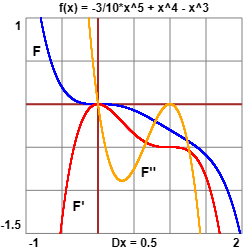 A questo punto calcolo F'(x) = -3/2·x4+4·x3-3·x2 e F"(x) = -6·x3+12·x2-6x Modifico lo script aggiungendo il tracciamento di F' e F" → Ho tutto quello che mi serve per rispondere al quesito.