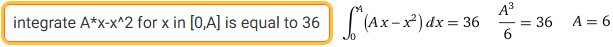 | y = A·x x2 è una parabola con la concavità verso il basso; interseca l'asse x quando A·x x2 = x·(A x) = 0, ossia per x=A e x=0. La figura di cui determinare l'area ha quindi l'aspetto a lato. Devo imporre: ∫[0,A] A·x x2 dx = 36 [Ax2/2 x3/3]x=A = 36 A3/6 = 36 A3 = 6·6·6 A = 6 | ![]() |