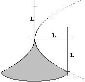 | Controlliamo l'ordine di grandezza riferendoci al cono di "raggio" 1 e "altezza" 1, che dovrebbe avere volume leggeremente maggiore; il volume di questo è π/3, che è effettivamente leggeremente inferiore a π/5. Quindi il volume cercato è πL3/5. | |