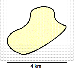 | Devo valutare l'estensione della superficie del paese di cui a fianco è riprodotta la cartina. Ho sovrapposto ad essa un foglio di carta quadrettata trasparente. Le dimensioni sono rappresentate nella figura. Valuta, approssimativamente, la superficie del paese. | ![]() |