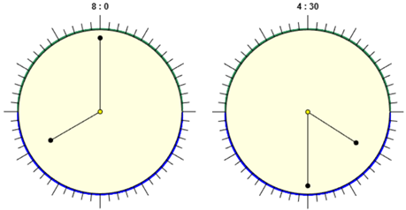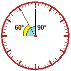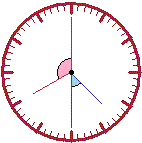 Sono esattamente le 9. Passano due ore. Le ore segnate sull'orologio sono 12. Quindi la lancetta delle ore avanza di 2/12, ovvero di 1/6 di giro. Dalle 9 alle 12 la rotazione è di 90°, quindi dalle 9 alle 11 la rotazione è di 60°. La lancetta dei minuti fa due giri completi, quindi ruota di 360°·2 = 720°. Alle 8 in punto le due lancette distano 4/12 di giro, ossia 1/3 di giro, ossia 360°/3 = 120° (angolo rosa a fianco). Alle 4 e mezza le lancette distano metà di un quarto di giro, ossia 90°/2 = 45°. |