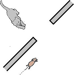 Ecco la vista dall'alto di un gatto e di un topo che si muove dietro ad un muro in cui è presente un'apertura. (1) Il gatto non può vedere il topo. Spiega (disegnando e a parole) perché. (2) Fino a dove potrebbe arrivare il topo (continuando a muoversi nella stessa direzione) per non essere visto? (3) Se il topo si fermasse nella posizione disegnata, dove dovrebbe spostarsi il gatto per vederlo? |