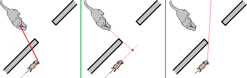 Volendo, per vedere (e "sperimentare") meglio la situazione, oltre che con carta e penna, il problema può essere affrontato anche con software semplice, come Paint e simili: basta copiare l'immagine, incollarla in Paint e usare il tracciamento di segementi fissando il primo estremo (sugli occhi del gatto o sulla testa del topo) e muovendo il secondo estremo fino a risolvere il problema.