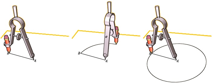 | Posso procedere usando un goniometro, tenendo conto che gli angoli sono uguali e quindi misurano 60° (vedi la figura sotto a sinistra) o un compasso, tracciando due cerchi (vedi la figura sotto a destra): |