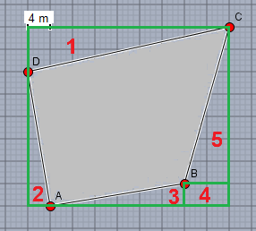 Ci conviene effettuare le misure usando come unità il lato dei quadretti sulla cartina, di 4 m. Poi trasformiamo tutto.