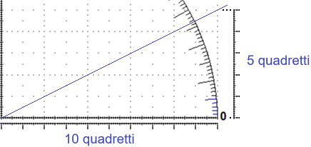 Come? Traccio su carta quadrettata una retta orizzontale e una retta inclinata che andando a destra di 10 quadretti salga di 5. Sovrappongo il goniometro in modo che il centro del goniometro coincida con l'intersezione delle due rette e che la direzione 0° coincida con la retta orizzontale: