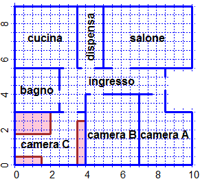 A destra è disegnata la pianta di un appartamento. Il lato dei quadretti corrisponde a mezzo metro nella realtà. (1) Calcola l'area dell'appartamento e scrivi i conti che hai fatto per trovarla. (2) Occupa più superficie l'ingresso o la camera B. (3) I mobili che conservano nel trasloco le persone che vanno a stare in questo appartamento sono solo quelli che andranno nella camera C, dove dormirà Luigi. Quanto spazio libero rimane a Luigi in questa stanza? | ![]() |