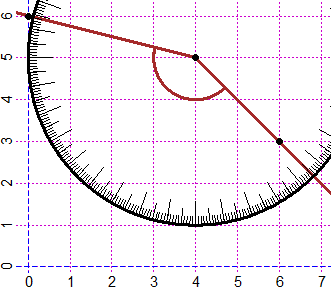 A fianco è tracciato l'angolo ∠ABC con A=(0,6), B=(4,5), C=(6,3). Utilizzando il goniometro raffigurato, determina quanto esso è ampio.