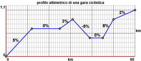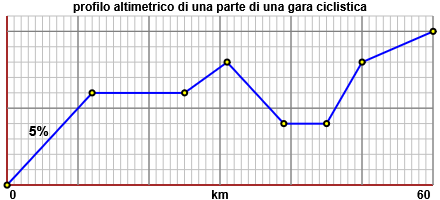 A lato è riprodotto il profilo altimetrico della parte iniziale di una tappa ciclistica: orizzontalmente è rappresentata (in km) la distanza lungo la strada dal punto di partenza, verticalmente è rappresentata la altitudine rispetto al livello del punto di partenza. Il primo tratto di strada, fino al 12° chilometro, ha una pendenza media di circa il 5%. Fissa la scala sull'asse verticale e stima la pendenza media negli altri tratti della tappa. |