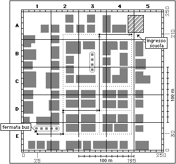 (3) Sia il percorso segnato con le frecce che gli altri percorsi tratteggiati in figura corripondono, grosso modo, alla stessa strada percorsa, ossia a 195-25 = 170 m verso destra e 210-30 = 180 m verso l'alto, ossia a 350 m di strada. (4) Il primo tratto, che parte da E1, è obbligatorio. Vediamo come si può proseguire: E2-E4-A4, E2-E3-D3-D4-A4, E2-E3-C3-C4-A4, E2-E3-A3-A4, E2-D2-D4-A4, E2-D2-D3-C3-C4-A4, E2-D2-D3-A3-A4, E2-C2-C4-A4, E2-C2-C3-A3-A4, E2-A2-A4. In tutto 10 percorsi. (5) Potrei procedere misurando il segmento che corrisponde alla distanza fermata-scuola e vedere che, a meno di 1/2 mm, coincide con l'altezza o la base della cartina, ossia a 250 m; tenendo conto dei limiti dell misurazioni, posso ritenere significative circa due cifre di questo valore. Oppure potrei pensare alla mia distanza come all'ipotenusa di un triangolo rettangolo avente i cateti lunghi 170 e 180 metri e quindi, per il teorema di Pitagora, l'ipotenusa lunga √(1702+1802) = 247.58 metri, che arrotondo a 250 metri (tenendo conto dell'approssimazione con cui conosco le coordinate dei punti e del fatto che ho ragionato come se il percorso fosse esattamente costituito da segmenti rettilinei.