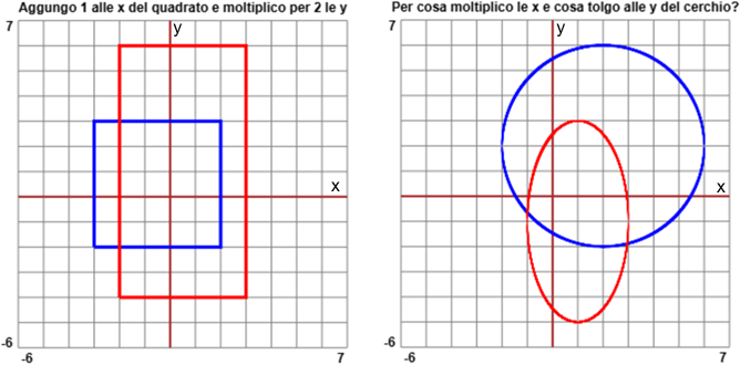 Sotto a sinistra è disegnato un quadrato e il rettangolo che si ottiene da esso aumentandone le x di 1 e moltoplicandone le y per 2. Per quale numero (maggiore o minore di 1) devo moltiplicare le x e quale numero (maggiore o minore di 0) devo addizionare alle y per trasformare il cerchio blu nella ellisse rossa?