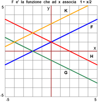 Osserviamo che il grafico di K è inclinato come quello di F. Incontra l'asse y (l'asse verticale) nel punto (0,3) invece che (0,1). Quindi
