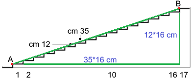 | Una scala è composta da 17 gradini ciascuno alto 12 centimetri e largo 35 centimetri, come illustrato nella figura a fianco. Qual'è la distanza degli spigoli del primo (A) e dell'ulitmo gradino (B)? |