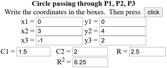 | Sarebbe stato molto più dispendioso risolvere il problema trovando il cerchio che passa per i tre punti. Con software che abbia incorporati gli opportuni algoritmi si sarebbe ovviamente proceduto più facilmente in questo modo. Ecco, a sinistra, che cosa si sarebbe ottenuto con lo script "cerchio 3P" presente qui. |