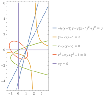 plot 8*(x-1)^2+y^2-6*y*(x-1)=0, plot (x-2)*y-1=0, plot x-y^2-2*y=0, plot x^2+x*y+y^2-1=0, plot x*y=0