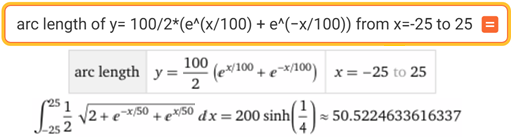 Un filo teso tra due piloni distanti 50 metri ha la forma della catenaria y = a/2·(ex/a + e−x/a) con a = 100 (metri). Calcola la lunghezza del filo arrotondata ai centimetri. Utilizza opportuni programmi per effettuare i calcoli coinvolti (vedi).
